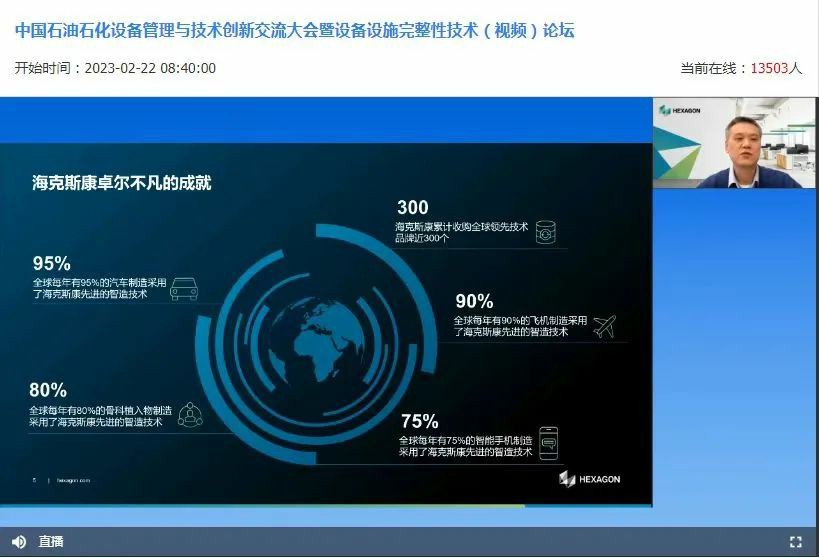 为了全面落实"十四五”规划部署,深入实施创新驱动发展战略,构建新发展格局,研讨交流前沿设备管理理念与技术,加快石油石化企业设备数字化、智能化建设,推动我国设备装备行业绿色高质量发展,进一步提升石油石化企业生产设备管理水平,中国石油学会石油科技装备专业委员会、中国设备管理协会石油石化装备发展中心联合于2023年2月22-23日举办了“中国石油石化设备管理与技术创新交流大会暨设备设施完整性技术(视频)论坛”。海克斯康数字智能作为该领域领军企业受邀与会,并进行演讲。本次大会共展开了三十余场高质量技术探讨和交流,吸引了2万余观众的观看和参与。
